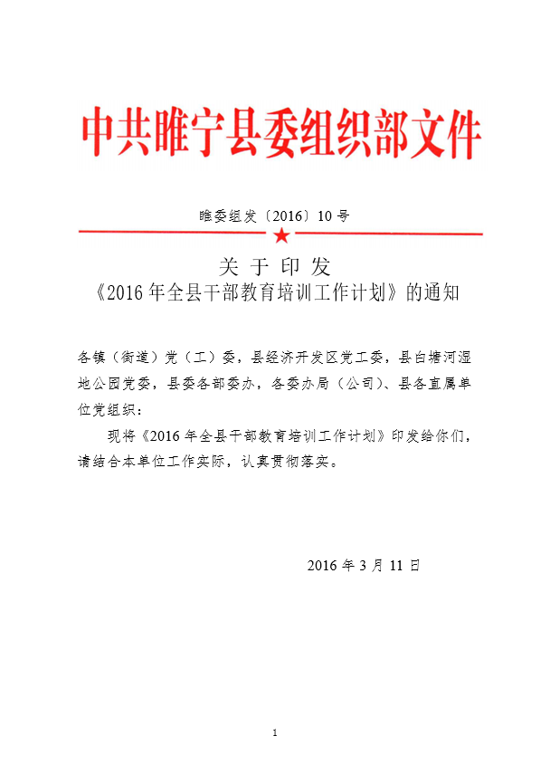 为切实做好2016年全县干部教育培训工作,进一步提高干部教育培训科学化水平,持续推进大规模培训干部、大幅度提高干部素质的战略任务,根据徐州市委组织部《2013—2017年干部教育培训工作实施意见》精神,结合我县干部教育培训工作实际,制定本计划。